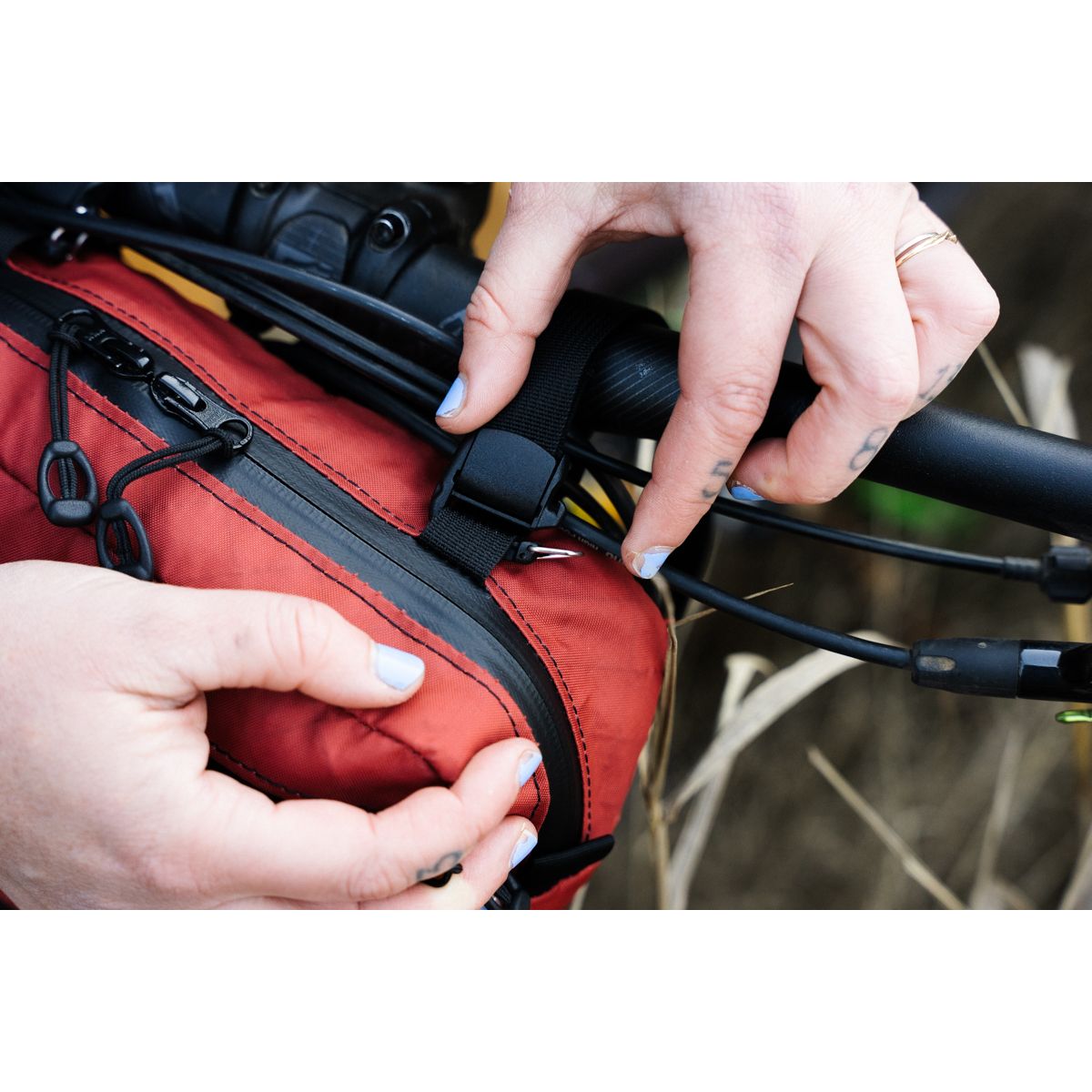 - Montage am Lenker: Cam-Lock-Riemen + elastische Kordel für den Vorbau