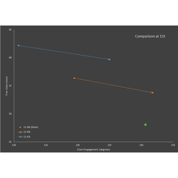Freie Kettenlänge bei 11 Zähnen (beeinflusst die Schaltpräzision):